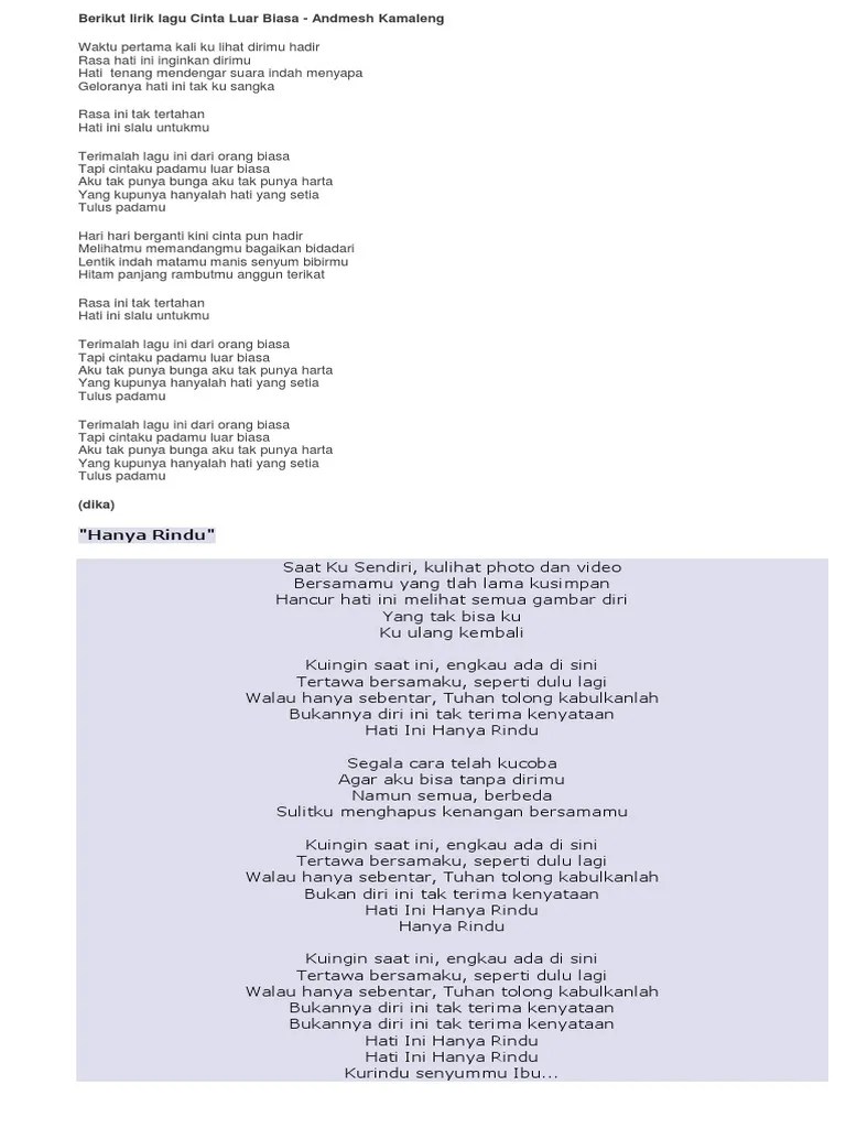 Cinta Luar Biasa Lyrics Chord / Chord Gitar Cinta Luar Biasa Macinjk. intro asus2 e/g# f#m dsus2 a/c# bm e / verse 1 a waktu pertama kali f#m ku lihat dirimu hadir bm rasa hati ini e/g# e inginkan dirimu / a hati tenang . Am d tapi cintaku padamu luar biasa ; C waktu pertama kali am ku lihat dirimu hadir dm rasa hati ini g . Berikut lirik dan chord lagu cinta luar biasa dari andmesh. Siapa yang tak kenal andmesh kamaleng ?